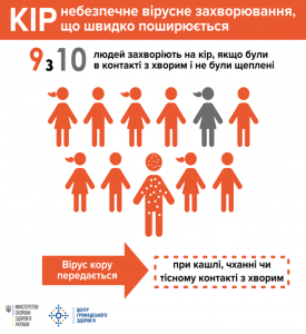Кір — надзвичайно заразне інфекційне захворювання, що передається від хворої людини до здорової повітряно-крапельним шляхом, тобто при чханні, кашлі або розмові хворого. Вірус кору може жити в повітрі та на поверхнях — до двох годин після того, як хвора людина залишила приміщення. 9 з 10 невакцинованих людей, що контактують із хворим, будуть заражені. Захворювання на кір може мати тяжкий перебіг і призвести до тяжких ускладнень — пневмонії, вушної інфекції, запалення мозку — енцефаліту, інших серйозних ускладнень, а також до інвалідності та смерті. Специфічного лікування від кору немає. Єдиний спосіб запобігти ускладненням і смерті від кору — вакцинація. Діти й дорослі, які не отримали профілактичне щеплення, перебувають у зоні ризику.